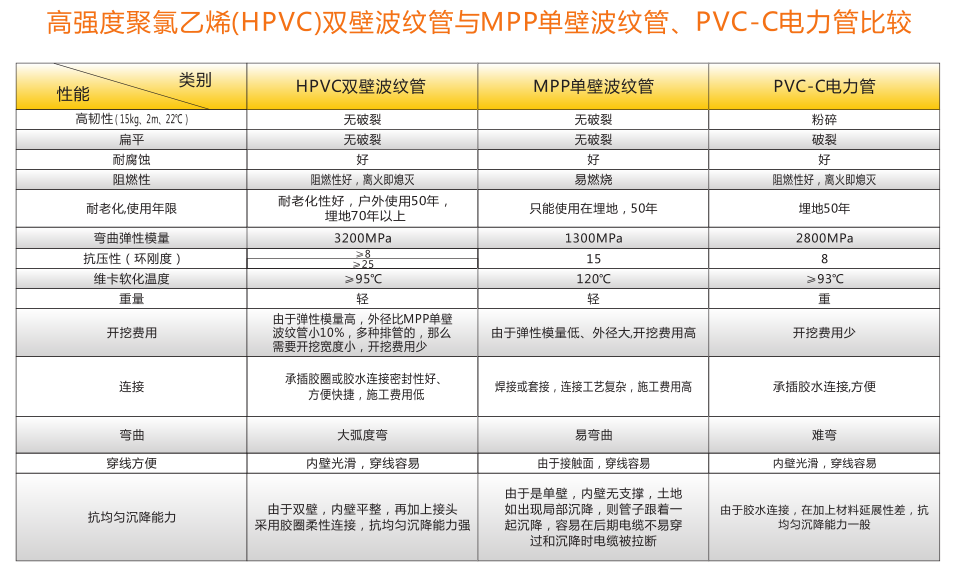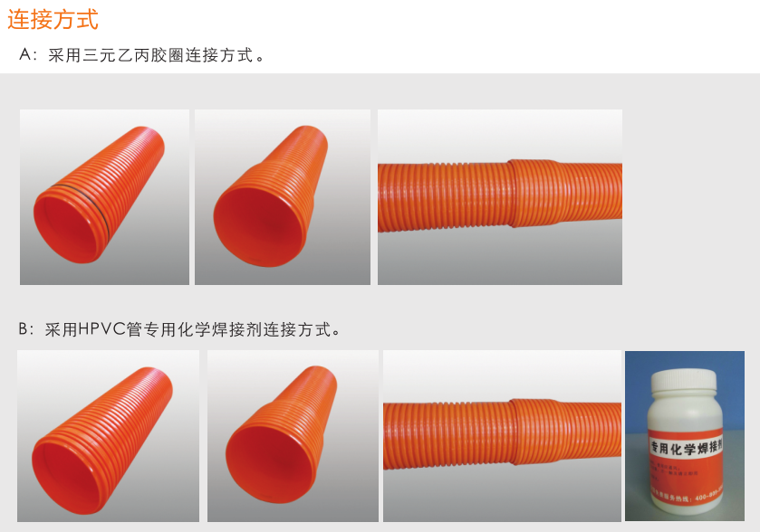 高强度聚氯乙烯(HPVC)双壁波纹管内、外壁之间呈中空环状结构,充分利用工字钢结构原理,提高截面 惯性矩,环钢度高。产品具有强度高、韧性好、质地轻等优点。产品运用开挖工程,可代替MPP单壁波纹管、玻璃钢管、PVC-C电力管、PVC-U通信管等管材。