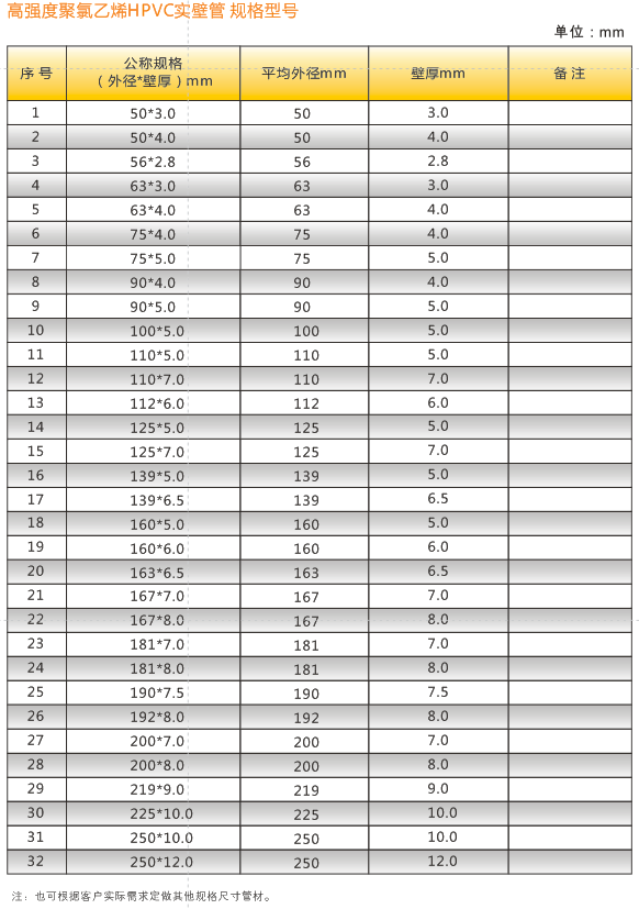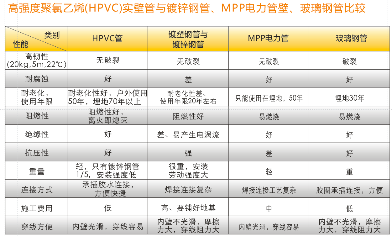 高强度聚氯乙烯(HPVC)实壁管具有高强度、高韧性、抗压强、阻燃性好、耐腐蚀等特点。产品可代替镀塑或镀锌钢管,横穿马路或穿越桥梁作为通信电缆?;す埽纱鍹PP、PE管用于非开挖管道。